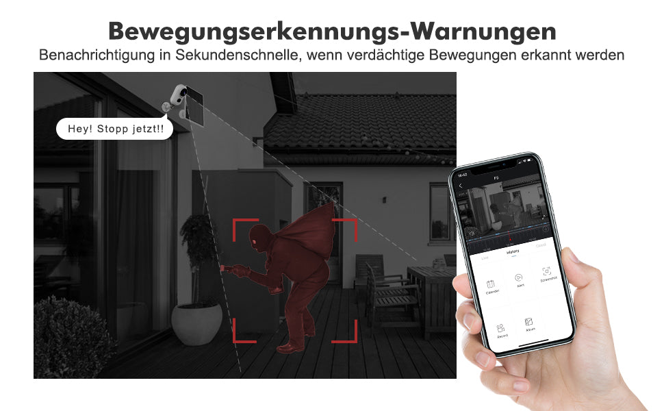 You can receive notifications on the app as soon as motion is captured and react quickly: scaring away suspicious persons via microphone or siren. From the phone, you can look back at past events anytime.