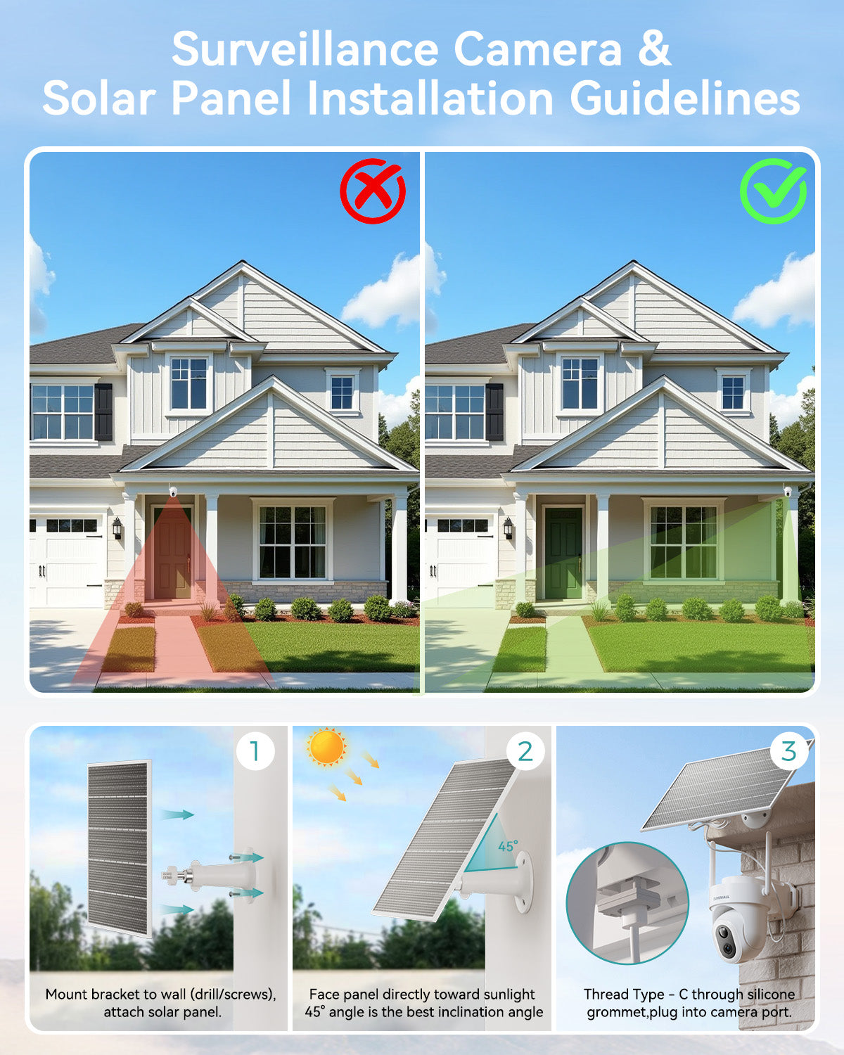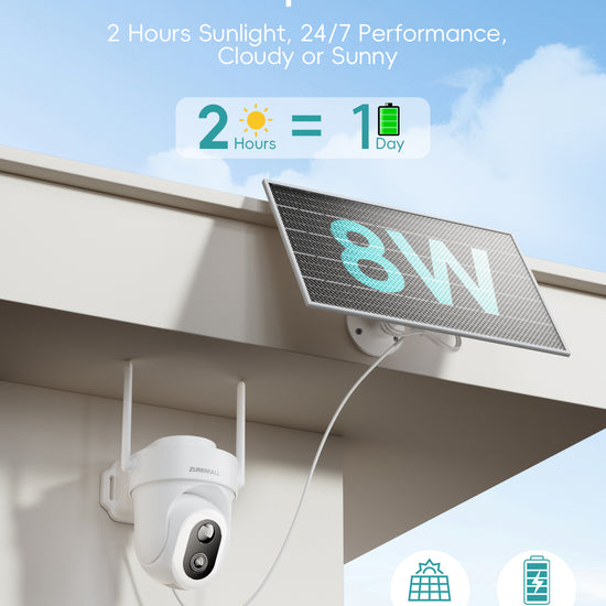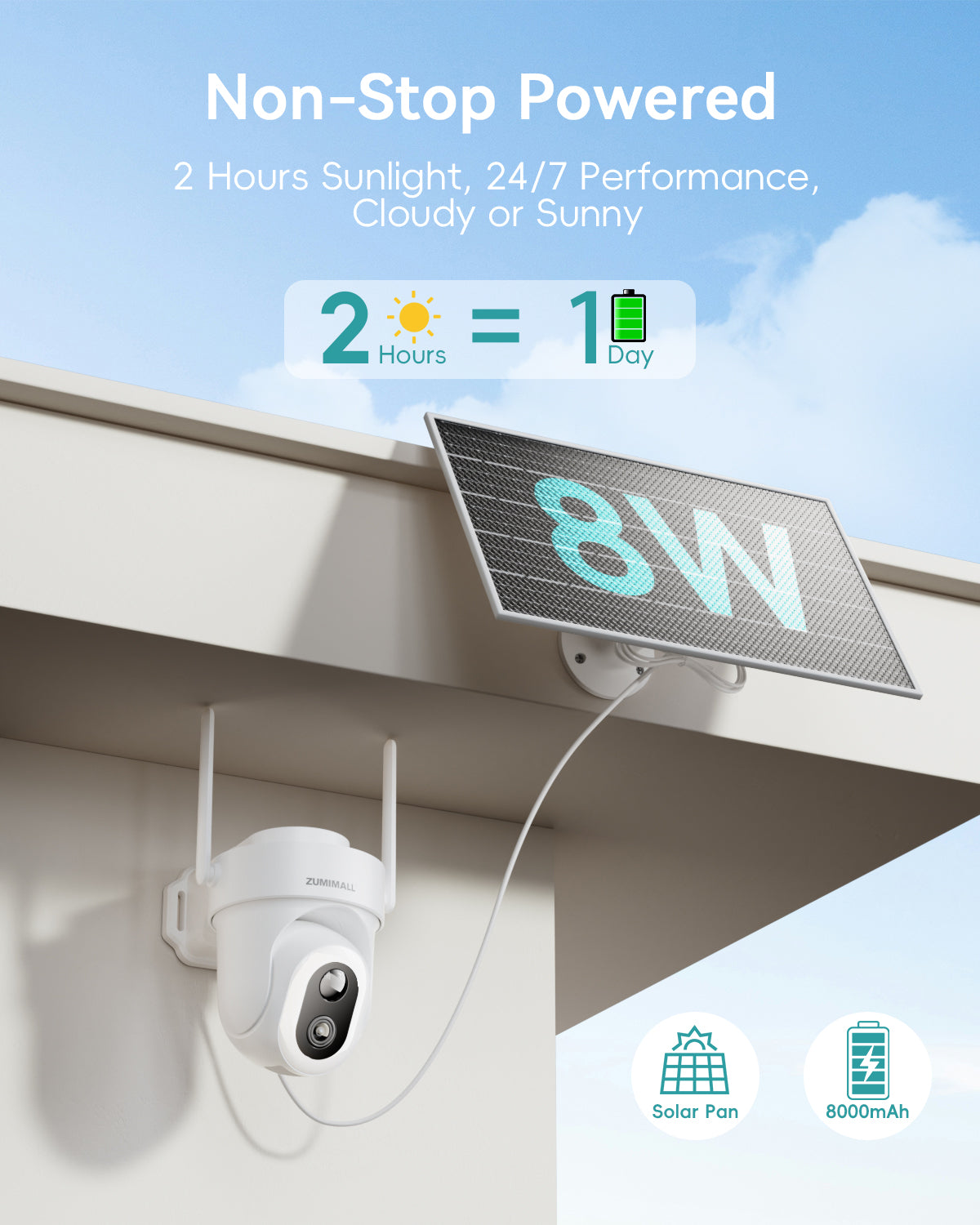 Solar-Powered & Wireless – 8W solar panel + 2×4000mAh battery enable 24/7 recording with just 2 hours of daily charging. Fully wireless for easy installation anywhere.