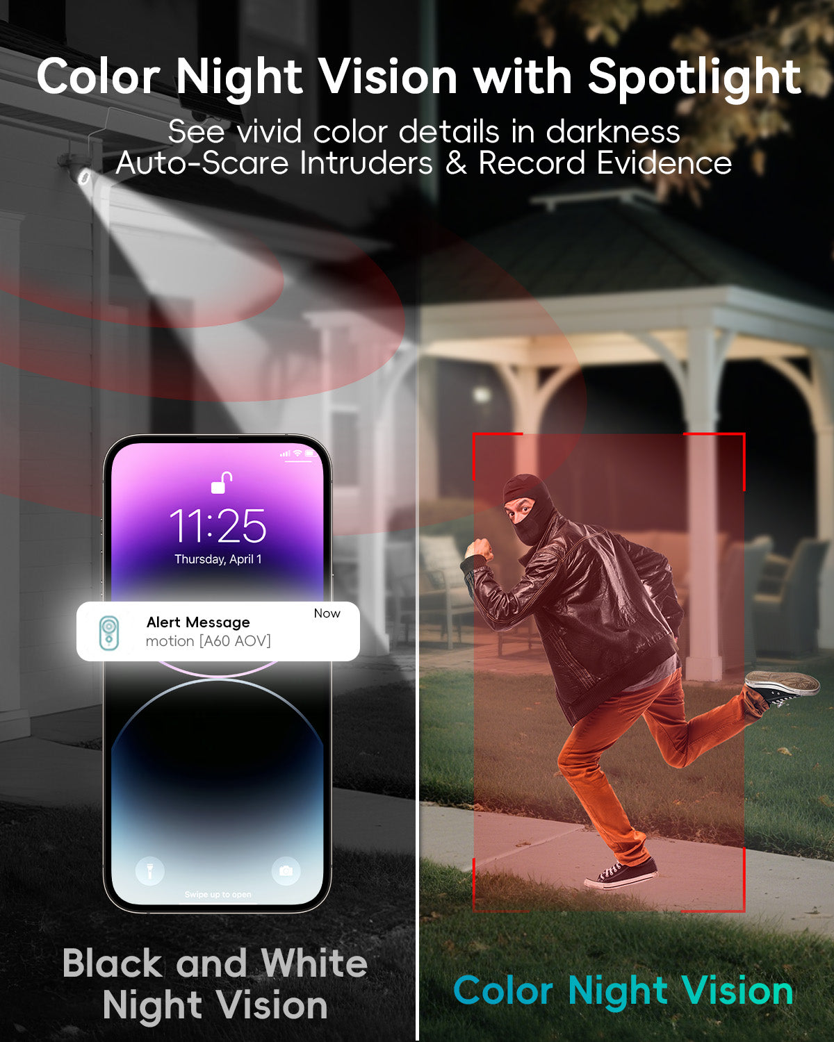 Enhanced Night Vision & AI Detection – 6 IR + 14 white LEDs for color night vision; AI identifies people, pets, vehicles, and packages with high accuracy.