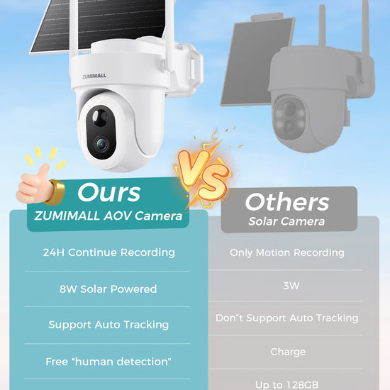 Always on Video, 24/7 Recording Camera - Different from standard solar security cameras wireless outdoor, the ZUMIMALL AOV camera overcomes the traditional limitation of solar powered security cameras that only record when detects moving objects. Powered by AI, ZUMIMALL AOV camera Automatically shifts to full frame rate upon motion detection and reduces it during inactivity for efficient 24/7 surveillance.