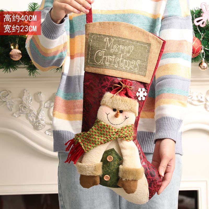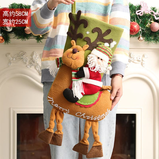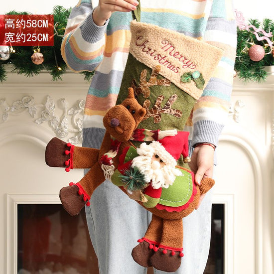 This adorable stocking features a cheerful snowman riding a reindeer, crafted from premium fabric with a soft, comfortable texture. The playful design adds whimsy and joy to your Christmas decor.