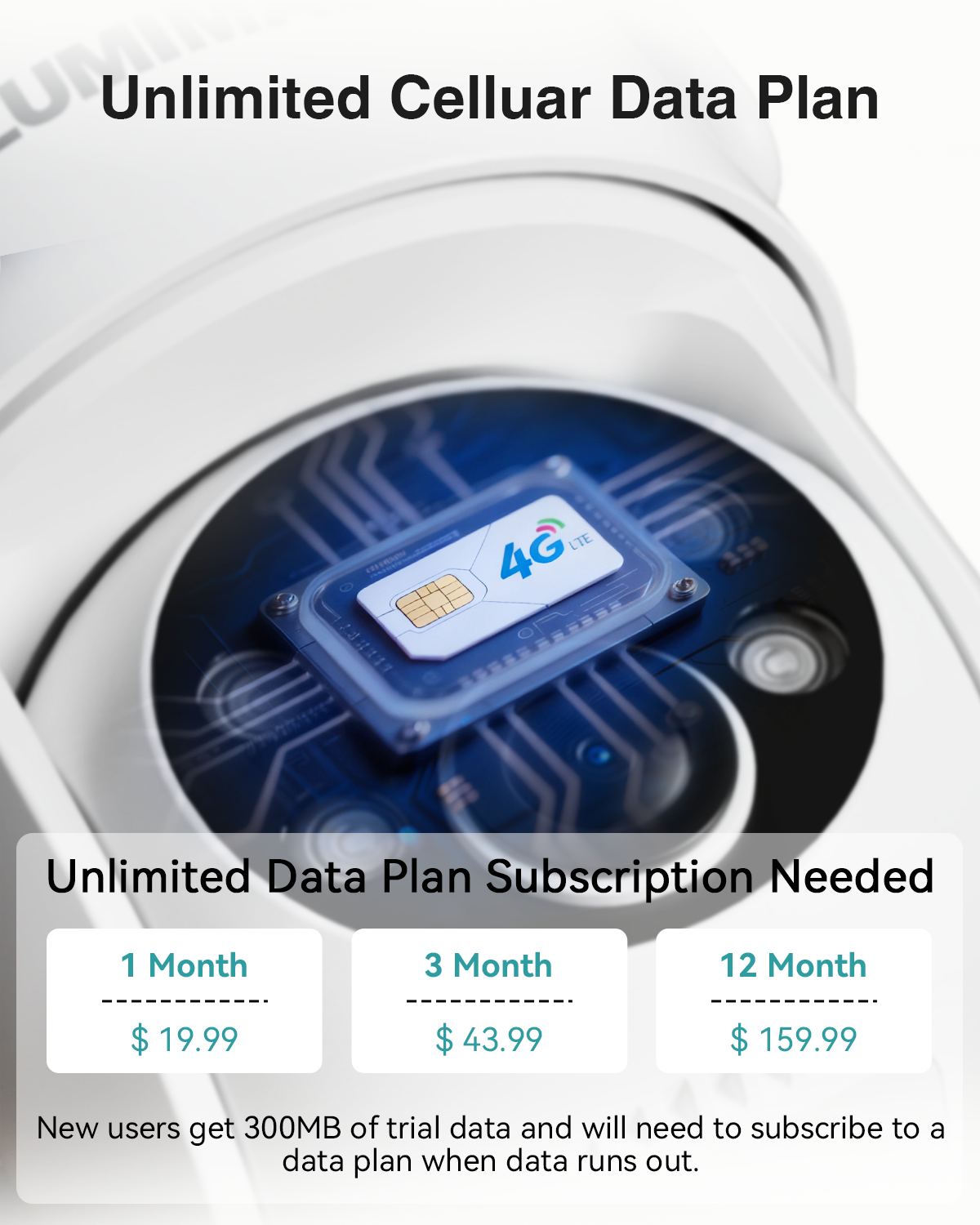 Automatically Switches to Strongest Network with Unlimited DataRecommendation: Use the provided virtual SIM for seamless cross-network roaming. For those using AT&T, T-Mobile, or Verizon SIM Card, ensure they are data-only plans. *300MB of free data is activated when the camera is first bound to the app