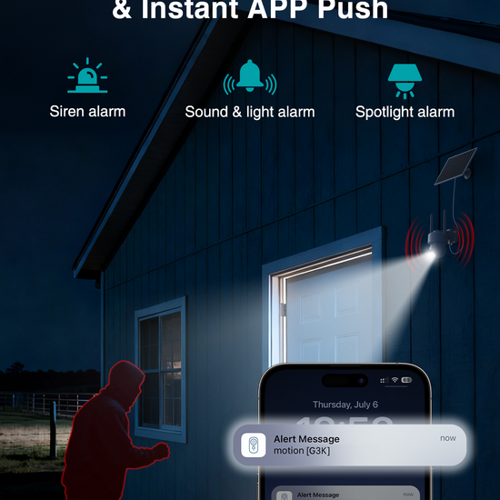 Instant AlertsWhen PIR detects a suspicious person, get instant app notifications + trigger audio-visual alarms (3 alert modes)